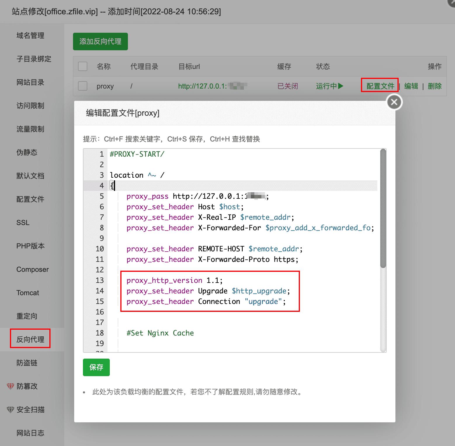以宝塔为例,可在反向代理中添加如下配置:
