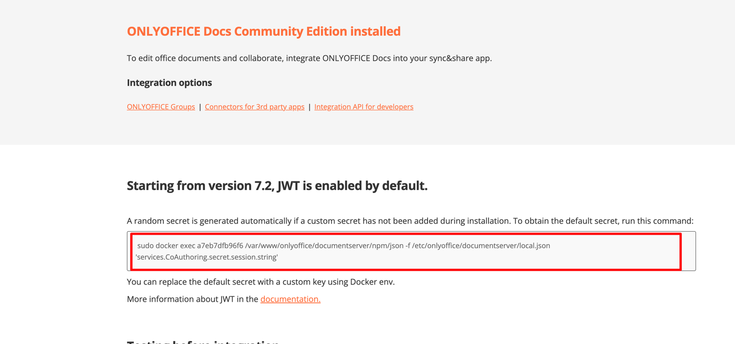 打开 OnlyOffice 页面,有提示执行指定命令来查看 JWT 密钥: