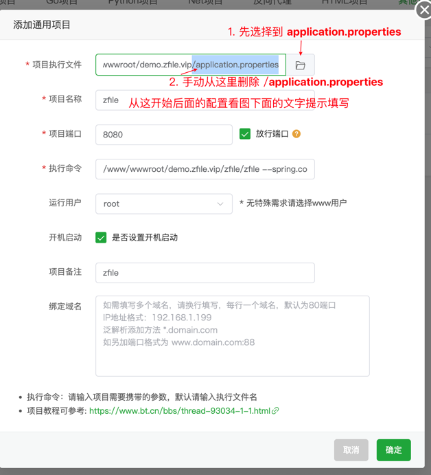 解压路径,如/www/wwwroot/demo.zfile.vip(宝塔要求必须选择一个文件,请选择application.properties,确定后手动删除掉/application.properties) - 项目名称:随便写,只要符合宝塔的规则即可(保存时会提示)