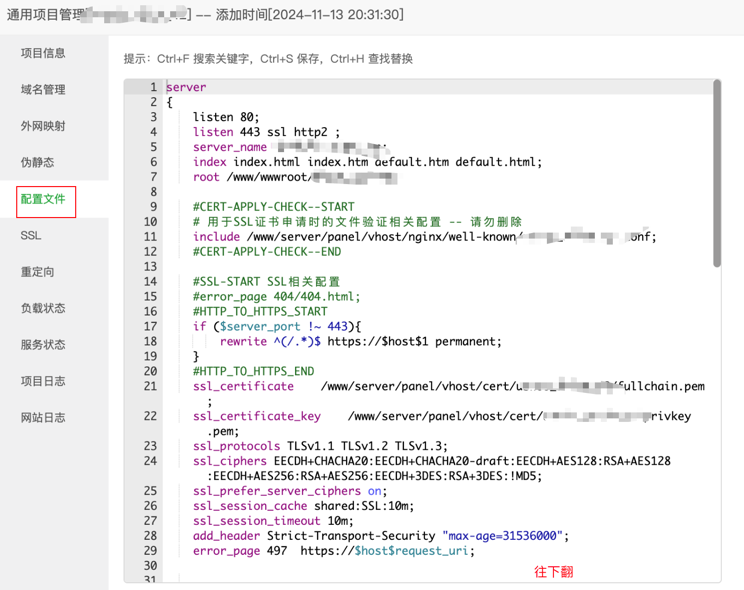 注意:如果你使用 9.x 的宝塔,可能会遇到宝塔的一个 bug,导致直链/短链跳转到 127.0.0.1,解决方法是在宝塔上 修改这个站点配置文件(不是ZFile配置文件),将