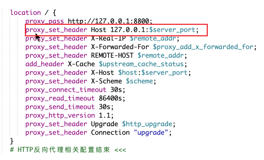 proxy_set_header Host 127.0.0.1:$server_port;修改为proxy_set_header Host $host:$server_port;,保存即可。