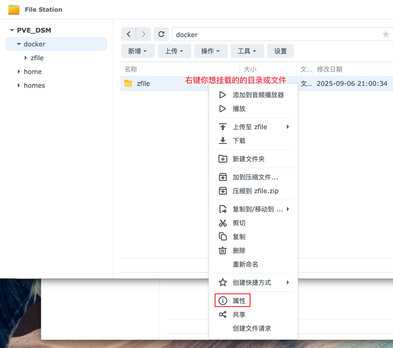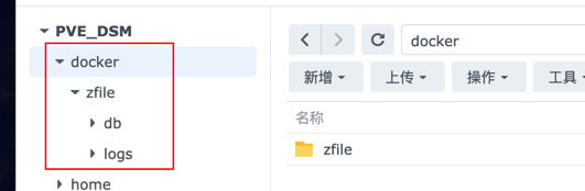 1. 打开 File Station,准备一个文件夹用于存放数据,我在 docker 目录下新建了 zfile 文件夹,并在这个目录下创建 dblogs 两个子目录。