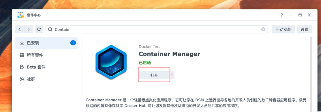 1. 打开「套件中心」,搜索并安装「Container Manager」。