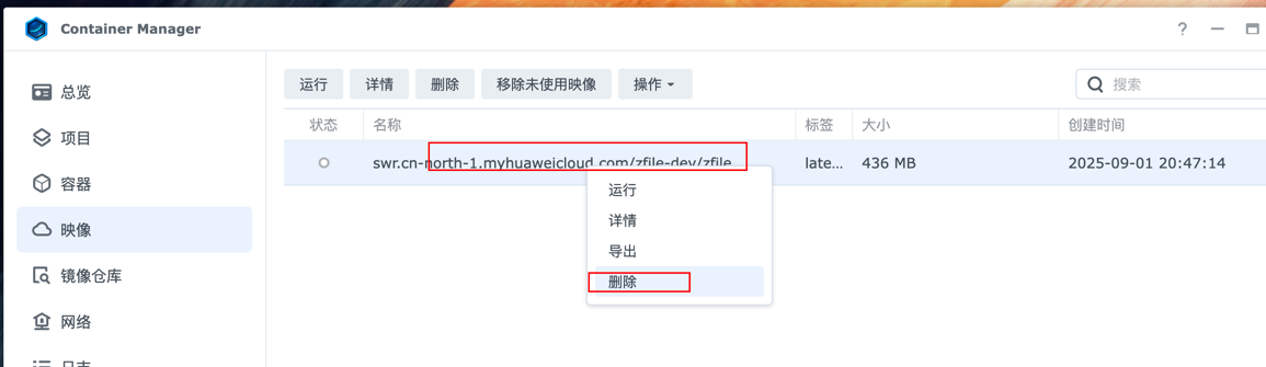 2. 然后点击左侧的「映像」,删除掉 swr.cn-north-1.myhuaweicloud.com/zfile-dev/zfile:latest 镜像。