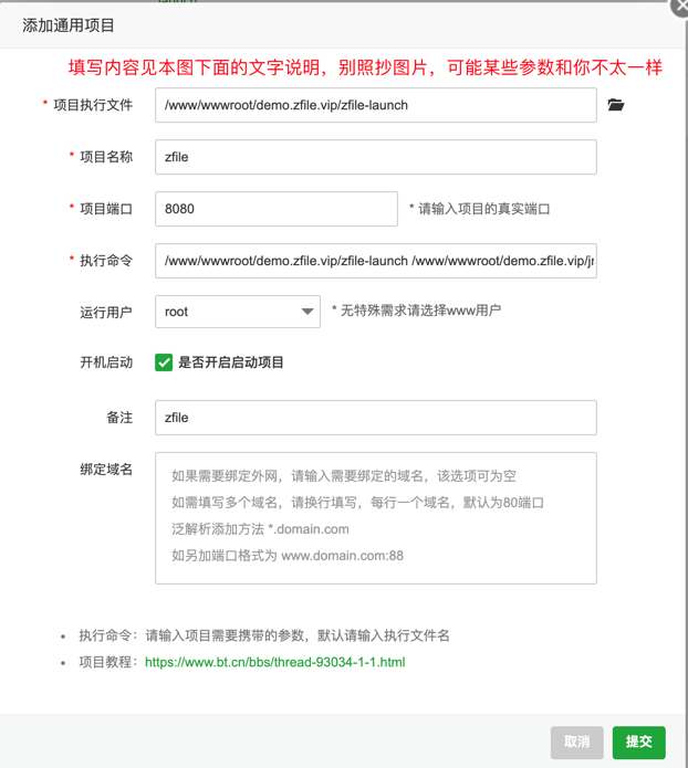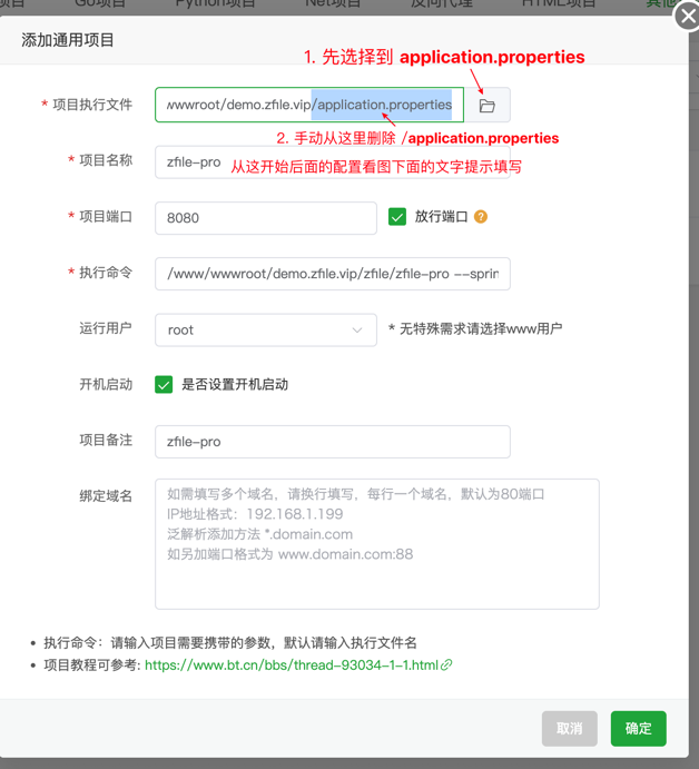 1. 项目执行文件:写 解压路径,如 /www/wwwroot/demo.zfile.vip(宝塔要求必须选择一个文件,请选择 application.properties,确定后手动删除掉 /application.properties